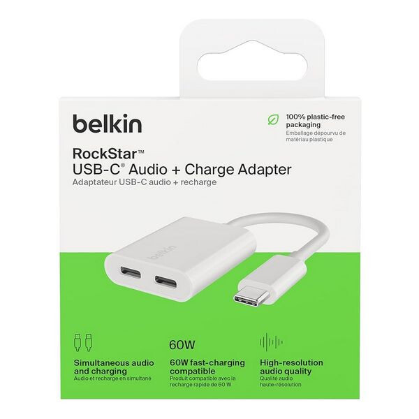 Адаптер Belkin RockStar USB Type-C для аудио и зарядки (F7U081btWH) White - заряжайте свое устройство, наслаждаясь музыкой, с помощью зарядного и аудиоадаптера USB Type-C от Belkin. Этот адаптер разделяет единственный порт USB Type-C вашего мобильного устройства на два, позволяя одновременно подключать зарядное устройство и один комплект проводных наушников. Это идеальный адаптер для тех, кто хочет слушать музыку, смотреть шоу или принимать звонки, отдыхая или лежа в постели. Оба входа USB Type-C обеспечивают сквозную быструю зарядку мощностью 60 Вт и аудиосигнал, избавляя от необходимости гадать, куда подключать кабели. Обратите внимание, что этот адаптер не пропускает видеосигналы.