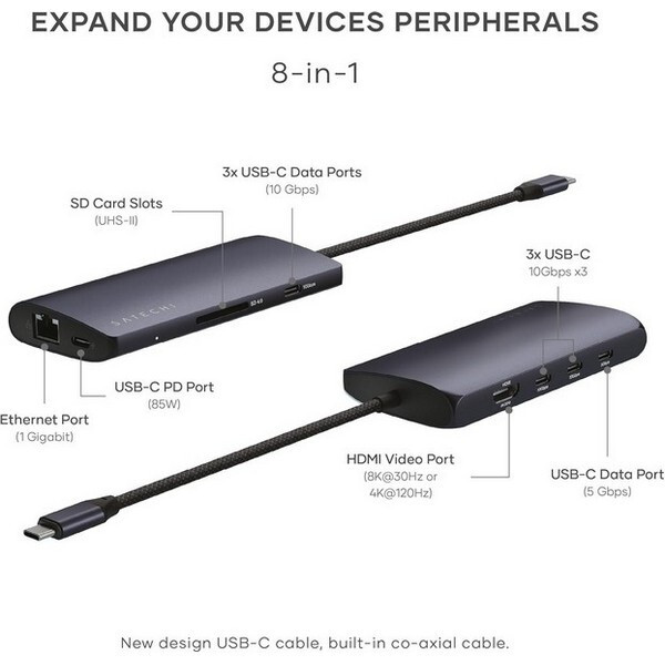 Адаптер оснащен портом HDMI, способным выводить изображение в разрешении до 8K при 30 Гц или в высокой четкости до 4K при 60, 120 и 144 Гц, что делает его идеальным для профессионального использования в графическом дизайне и видеообработке. Дополнительно, три порта USB-C поддерживают скорость передачи данных до 10 Гбит/с, а еще один порт USB-C — до 5 Гбит/с, удовлетворяя потребности в быстрой и эффективной передаче данных.