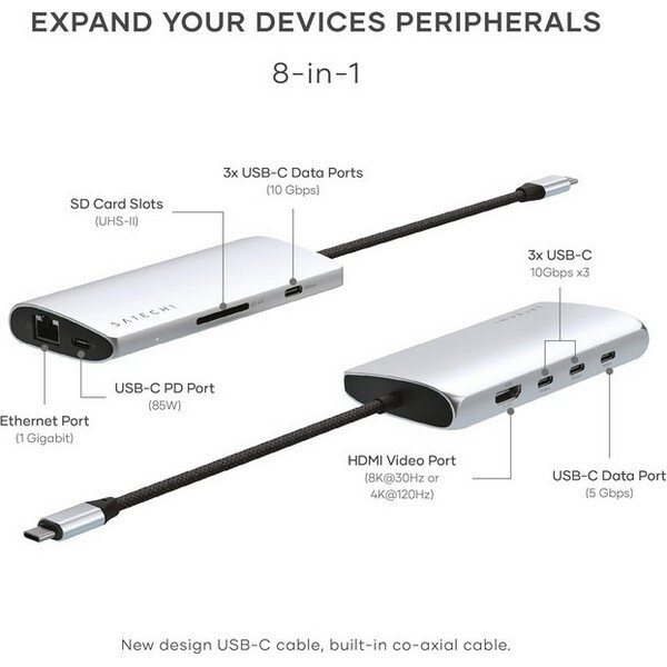 Адаптер Satechi USB-C Multiport Adapter 8K Ethernet V3 (ST-P8KES) Silver предлагает экспансивные возможности подключения и мощное решение для зарядки. С портом USB-C PD, который поддерживает зарядку до 100 Вт, этот адаптер способен обеспечивать максимальную выходную мощность до 85 Вт, что идеально подходит для зарядки ноутбуков и других устройств без активной передачи данных или видеосигнала.