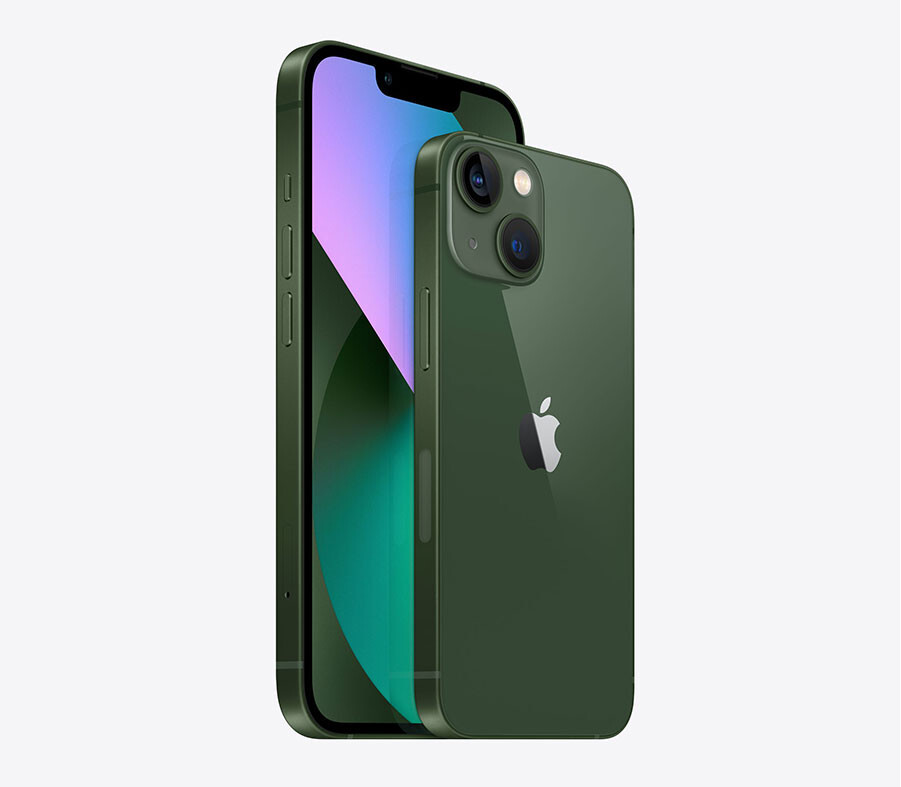 Компания Apple на презентации 8 марта 2022 года представила iPhone 13 в новом, зелёном цвете. Корпус iPhone 13 выполнен из алюминия, поэтому новый цвет получился глубоким и насыщенным. В остальном iPhone 13 остался прежним: дисплей Super Retina XDR (OLED) с диагональю в 6,1 дюйма. Система двух камер 12 Мп: широкоугольная и сверхширокоугольная с фотографическими стилями, ночным и портретным режимами, а так же режимом «Киноэффект» для съёмки видео с малой глубиной резкости (1080p с частотой 30 кадров в секунду).