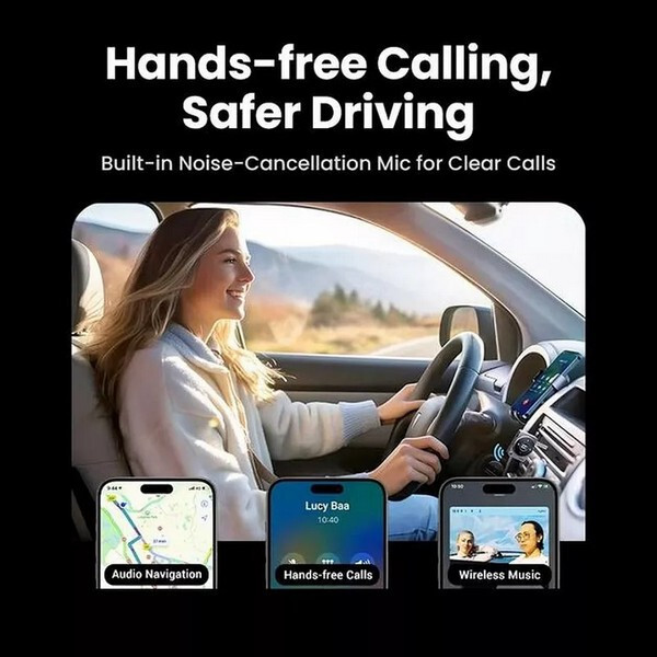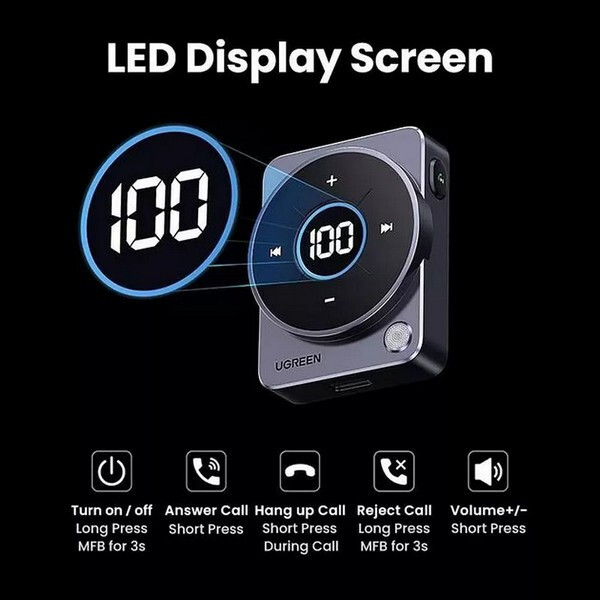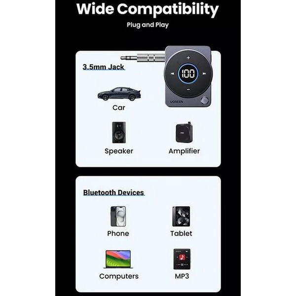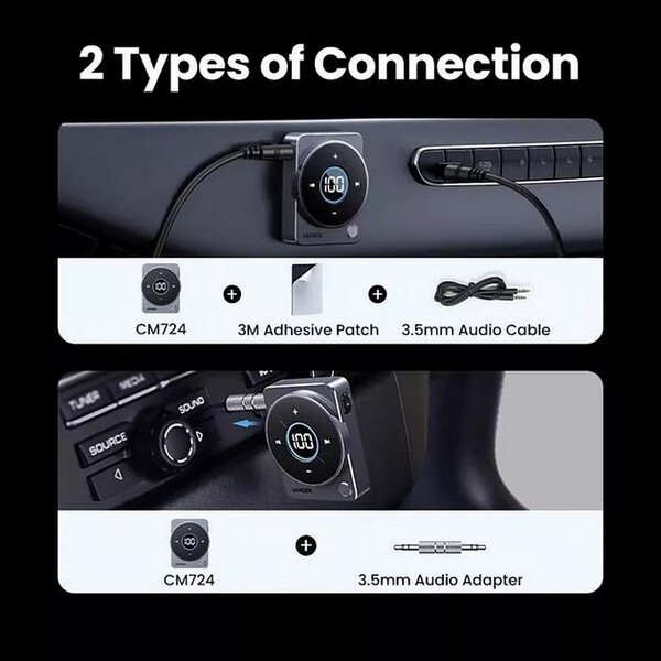 UGREEN CM724 оснащён встроенным микрофоном, что обеспечивает чёткую связь во время звонков. Большая кнопка управления позволяет легко отвечать на звонки, не отвлекаясь от вождения, обеспечивая безопасность и комфорт. Адаптер поддерживает кодеки SBC и AAC, что способствует отличному качеству звука при прослушивании музыки. Он совместим с автомобильными аудиосистемами, колонками, усилителями и наушниками. Для подключения достаточно использовать стандартный AUX-разъём 3.5 мм, что делает адаптер удобным решением для подключения мобильных устройств к различным аудиосистемам.