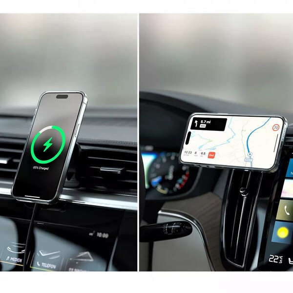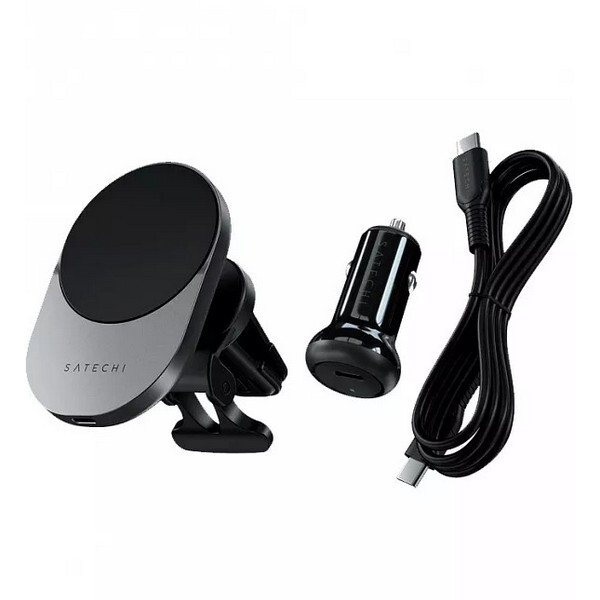 Устройство легко крепится к вентиляционной решетке автомобиля с помощью надежного стабилизирующего зажима и мощного магнита, который надежно удерживает телефон даже во время движения. Для удобства использования в комплект входит кабель USB-C длиной 1 м и адаптер для прикуривателя мощностью 25 Вт, что позволяет начать пользоваться устройством сразу после установки.