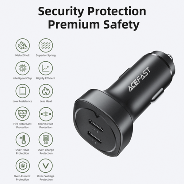 Автомобильное зарядное устройство Acefast B2 изготовлено из огнеупорного пластика и металла. Оно оснащено множеством защит от перегрева, перегрузки и короткого замыкания. Работать с ним очень просто — достаточно вставить его в гнездо прикуривателя. Acefast B2 — это превосходный компаньон в дороге, ведь с ним вас не будет беспокоить проблема разрядившегося смартфона или планшета.