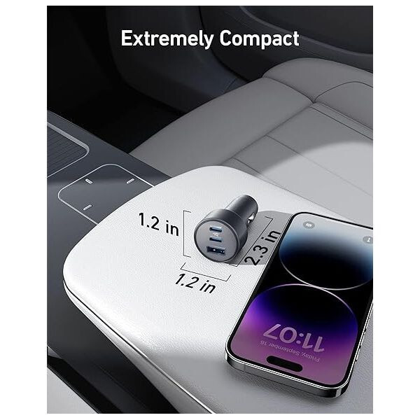 Сверхкомпактное: маленькое и компактное автомобильное зарядное устройство размером всего 2,3 × 1,2 × 1,2 дюйма делает его идеальным спутником в путешествии для бесперебойной работы в дороге.