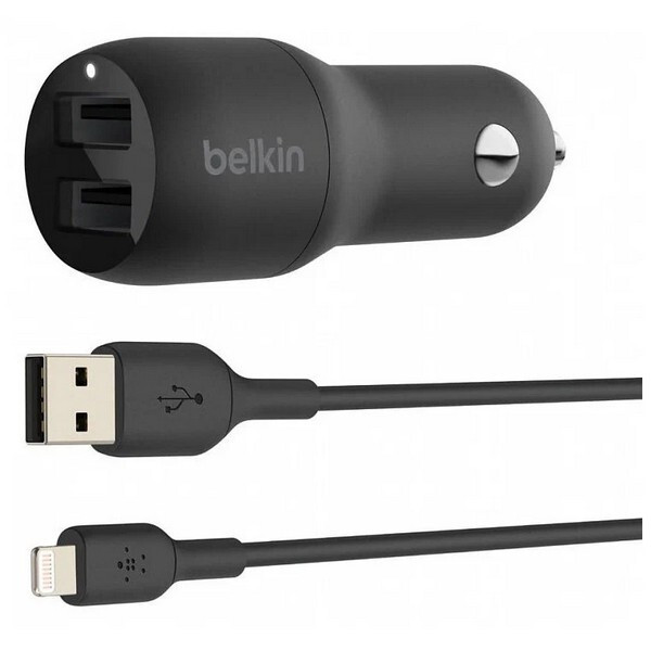 Автомобильное зарядное устройство Belkin 2 USB-A, 24W, кабель USB-A-LTG 1m, черный (CCD001bt1MBK) представляет собой автомобильное зарядное устройство, которое рассчитано на зарядку как смартфонов, так и планшетов. Для подключения заряжаемых гаджетов в модели предусмотрено два выхода USB тип A, которые обеспечивают суммарную мощность в 24 Вт и силу тока 4.8 А. В комплекте поставляется кабель USB-A/Lightning.