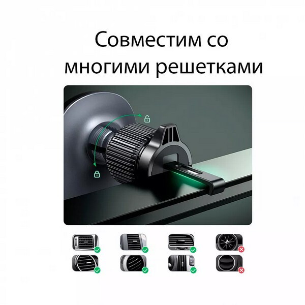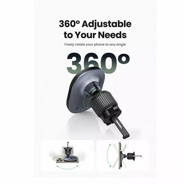 Автомобильное зарядное устройство Ugreen CD345 Magnetic Wireless Car Charger (25925) черный - автомобильный держатель с встроенной зарядкой Magsafe, который подходит для использования с iPhone с функцией Magsafe, а также для других смартфонов с поддержкой беспроводной зарядки при наличии магнитного чехла. Он позволит не только удобно закрепить ваш смартфон в автомобиле, чтобы комфортно использовать его во время пути, но и одновременно заряжать его. Автодержатель надёжно устанавливается в решётку воздуховода, а магнитное крепление не только надёжно держит смартфон на подставке, но и позволяет расположить его в вертикальном или горизонтальном положении.