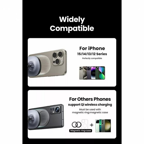 Автомобильный держатель Ugreen CD345 сочетает в себе удобство и безопасность использования. Оснащенный 18 мощными магнитами N52H, он позволяет быстро закрепить телефон или снять его с держателя, что значительно повышает комфорт во время поездки. Благодаря поддержке беспроводной зарядки мощностью до 15 Вт, ваш телефон всегда будет заряжен, даже в длительных поездках. Совместимость с технологией Qi делает устройство универсальным для большинства моделей смартфонов с функцией индуктивной зарядки. Поворотный механизм на 360 градусов позволяет настроить удобный угол обзора, будь то вертикальное или горизонтальное положение телефона. Держатель надежно фиксирует устройство даже на неровной дороге или при резком торможении, а удлиненный крючок обеспечивает совместимость с различными вентиляционными решетками. Этот аксессуар выполнен из прочных материалов PC и ABS, что гарантирует его долговечность и стильный внешний вид.
