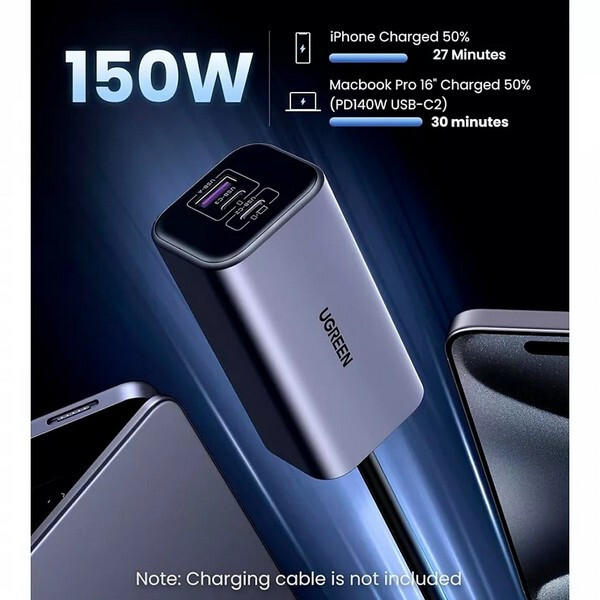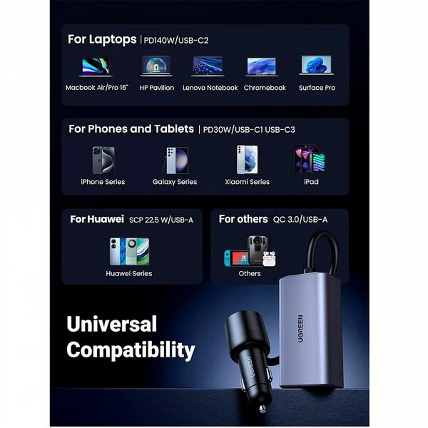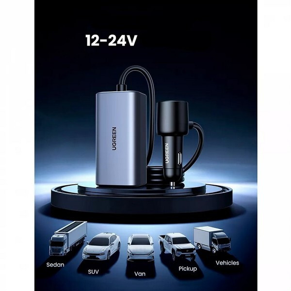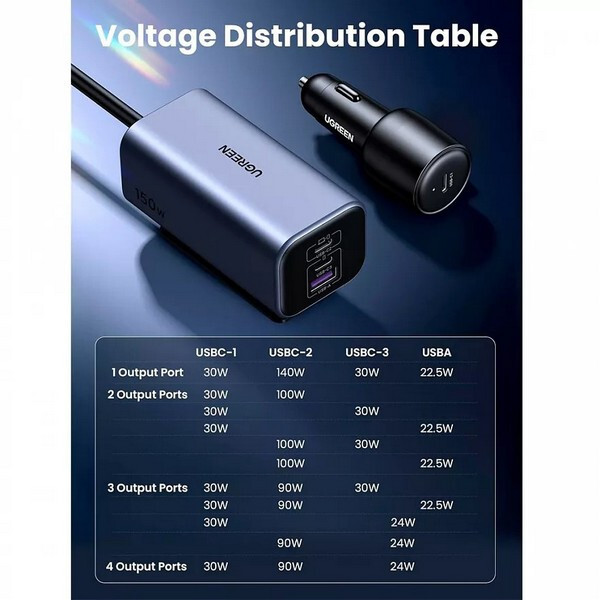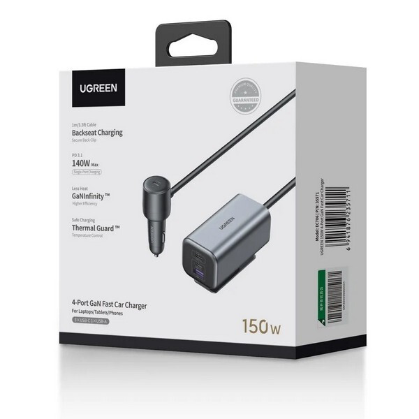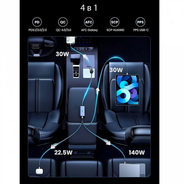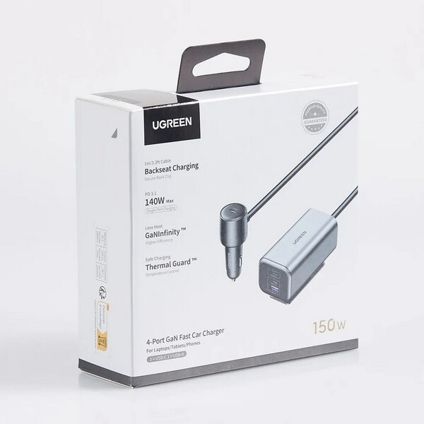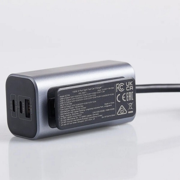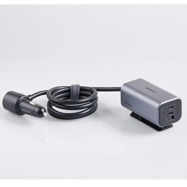 Автомобильное зарядное устройство Ugreen EC706 150W 4-Port GaN с выносом портов USB-A / 2*USB-C (35571) серый предназначено для быстрого и одновременного зарядки нескольких устройств. Благодаря технологии GaN он обеспечивает высокую мощность, быструю зарядку и компактные размеры, оставаясь эффективным и безопасным. Адаптер имеет 3 порта USB-C и один USB-A, что позволяет подключать до четырёх устройств одновременно. Совместим с широким спектром устройств, включая смартфоны, планшеты и ноутбуки. Удобный дизайн с клипсой и кабелем длиной 1 м делает его подходящим для использования в любых автомобилях с напряжением 12–24 В.