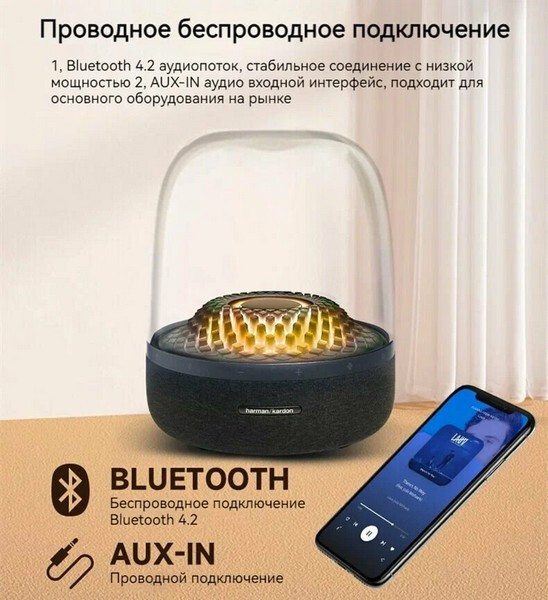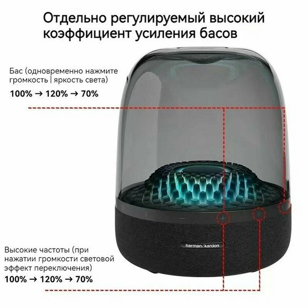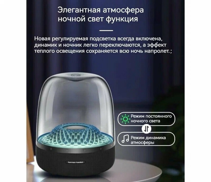 Беспроводная акустика Harman/Kardon Aura Studio 4 White Gray представляет собой обновленную версию знаменитой беспроводной акустики от всемирно известного бренда. Ключевая особенность модели заключается в необычном внешнем виде, которая делает акустику не только отличным решением для прослушивания музыки, но и ярким дополнением к домашнему интерьеру. В акустике предусмотрена подсветка в 5 разных цветах, которая отлично смотрится при слабом освещении. За звук отвечают шесть излучателей диаметром 40 мм каждый и сабвуфер диаметром 130 мм, суммарная мощность которых составляет 130 Вт. Частотный диапазон модели составляет 45 - 20000 Гц, а расположение излучателей обеспечивает всестороннее распространение звука по комнате. Для питания модель использует подключение к сети, а для воспроизведения музыки предусмотрено беспроводное подключение Bluetooth.