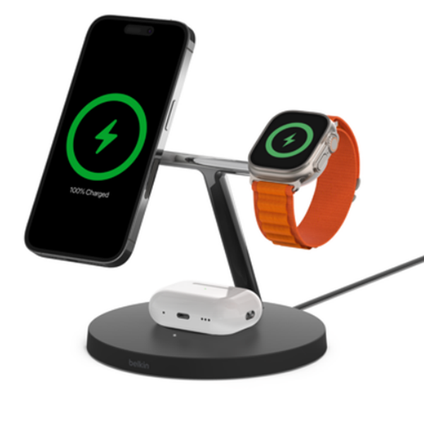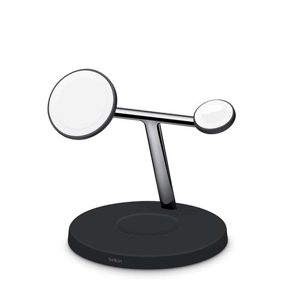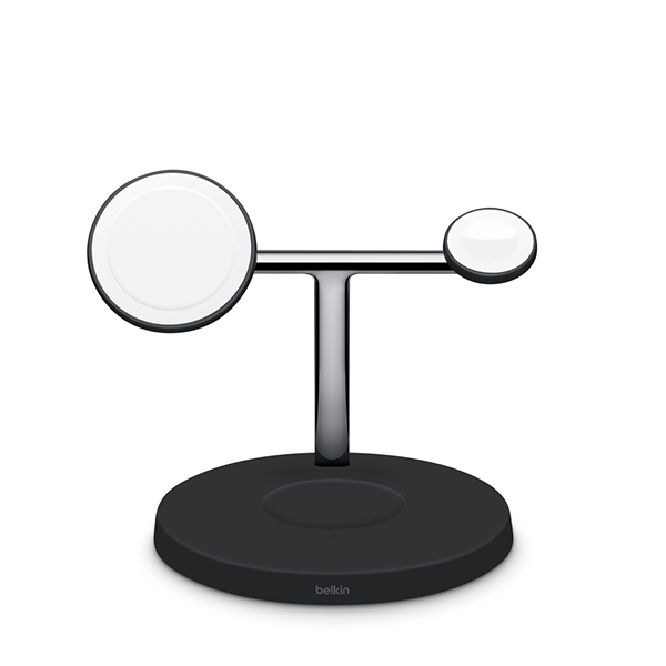 Беспроводная зарядная подставка Belkin BOOST Charge 3-в-1 с MagSafe - это удобный способ максимально быстро зарядить все ваши устройства Apple. Новый магнитный модуль быстрой зарядки заряжает новейшие Apple Watch Series 7 от 0 до 80% примерно за 45 минут. В то же время вы можете быстро и безопасно заряжать свой iPhone в портретном или ландшафтном режиме на зарядной подставке Magsafe и свои AirPods на беспроводной зарядной станции Qi.