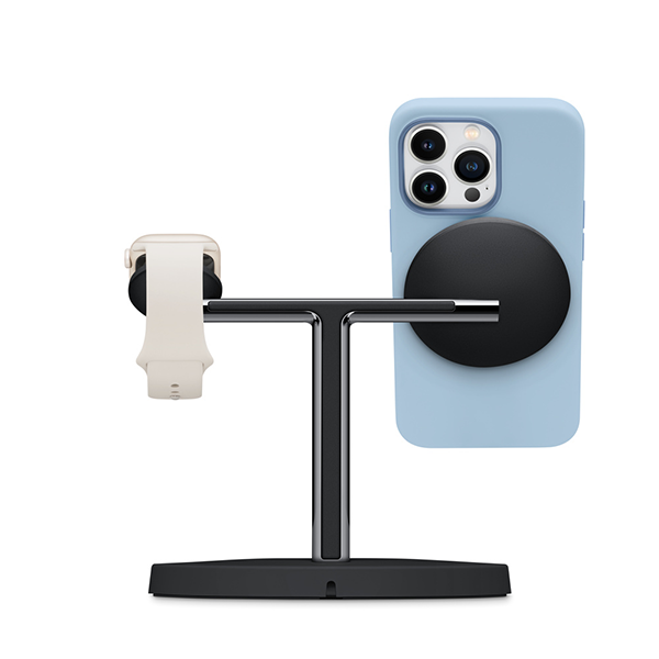 Зарядное устройство состоит из беспроводной подставки MagSafe мощностью до 15 Вт для iPhone 12 или новее, нового магнитного модуля быстрой зарядки для Apple Watch Series 7 и Qi Pad для беспроводной зарядки ваших AirPods или AirPods Pro.