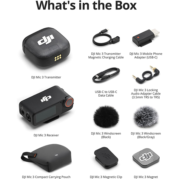 Комплектация: передатчик DJI Mic 3, приёмник DJI Mic 3, магнитный кабель для зарядки передатчика, адаптер для мобильного телефона DJI Mic 3 (USB-C), кабель передачи данных USB-C — USB-C, аудиокабель-адаптер с фиксатором DJI Mic 3 (3,5 мм TRS-TRS), ветрозащитный экран DJI Mic 3 (чёрный/серый), ветрозащитный экран DJI Mic 3 (чёрный), магнит DJI Mic 3, магнитный зажим DJI Mic 3, компактный чехол для переноски DJI Mic 3.