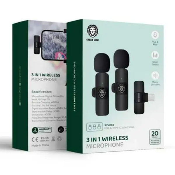 Беспроводной микрофон Green Lion 3 в 1 — это революционное аудиоустройство, предназначенное для превосходного захвата звука и универсальности. Одна из его выдающихся особенностей — три разных порта — USB-A, Type-C и Lightning, удовлетворяющие разнообразные потребности в подключении. Эти многочисленные порты обеспечивают непревзойденную гибкость, что делает его совместимым с широким спектром устройств, включая ноутбуки, смартфоны и планшеты.