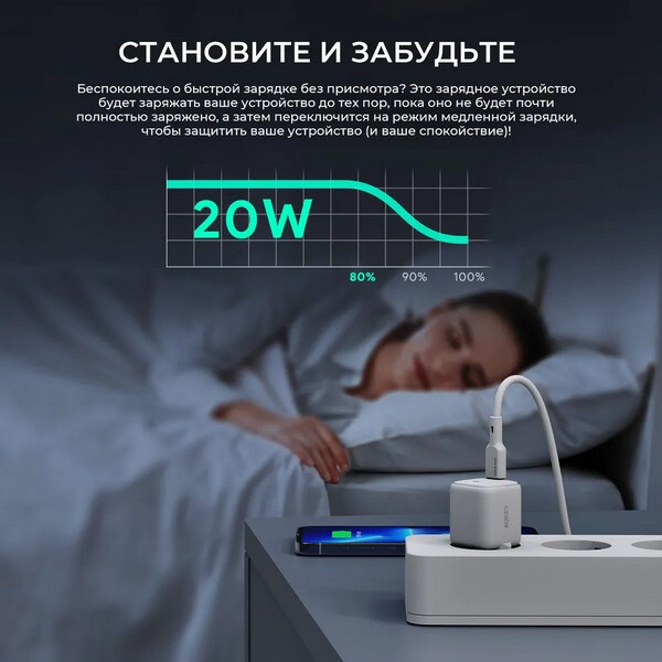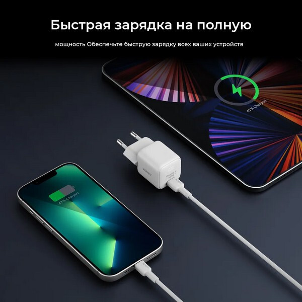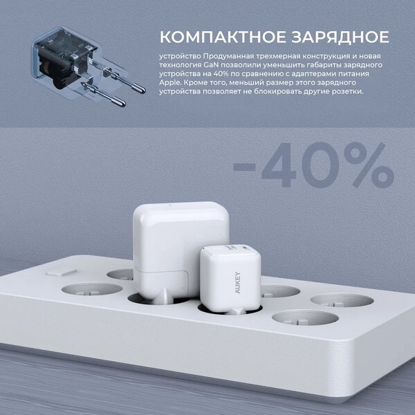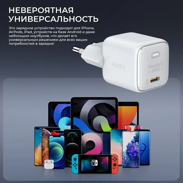 В Aukey Omnia Mini 20W PD USB-C PA-B1 использован универсальные порт USB-C, благодаря чему можно заряжать большинство современных портативных устройств. Зарядное устройство имеет ультракомпактные размеры – вдвое компактней комплектного зарядника Apple. Не смотря на малые размеры Aukey Omnia Mini имеет выходную мощность в 20Ватт, что обеспечивает высокую скорость зарядки.