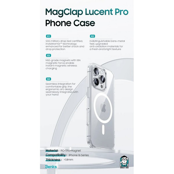 Чехол Benks Lucent Pro Case (MagSafe) для iPhone 16 Pro 6.3" прозрачный (Transparent) - испытайте защиту телефона на следующем уровне с помощью LevitaMag™ Lucent Pro: идеальный прозрачный защитник. Благодаря передовой технологии LevitaMag™ он сохраняет ваш телефон в первозданном виде и в безопасности, исключая царапины. Добро пожаловать в непревзойденную, кристально чистую прочность.