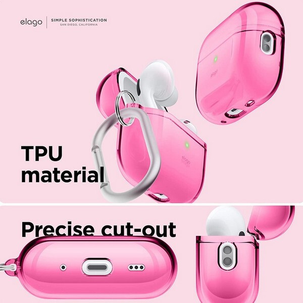 Чехол Elago Clear Hang case для AirPods Pro 2 (2022) (EAPP2CL-HANG-NHP) неоновый розовый из плотного силикона плотно облегает кейс, при этом сохраняя все его функции. Такой материал отлично защищает от различных царапин, потертостей и прочих повреждений; легко очищается от загрязнений. Перфорированная сетка, расположенная внутри, предотвращает появление конденсата и помогает избежать прилипания чехла к футляру. Модель оснащена алюминиевым карабином, с помощью которого можно прикрепить кейс к рюкзаку или на пояс, тем самым предотвратив его потерю. Для возможности проводной зарядки предусмотрена прорезь для кабеля. Крышка крепится за счет нескользящего покрытия на внутренней поверхности, достаточно просто прижать ее.