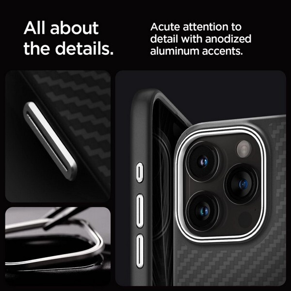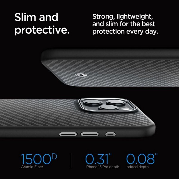 Чехол Spigen Enzo Aramid для iPhone 15 Pro (ACS07045) Matte Black - это чехол, который сочетает в себе новейшие технологии и материалы, обеспечивая максимальную защиту вашего смартфона, не жертвуя элегантным дизайном. Он изготовлен из передового арамидного волокна, которое известно своей необычайной прочностью. Точная алюминиевая отделка не только придает ему уникальный вид, но и обеспечивает дополнительную защиту от ударов и повреждений. Case был разработан с учетом минимализма. Этот продукт очень легкий, поэтому вы не почувствуете лишнего веса в кармане или в руке.