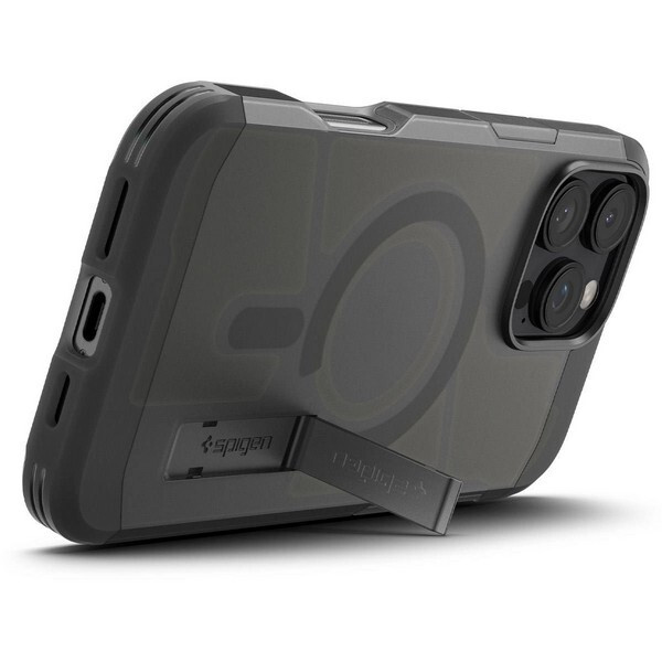 Чехол Spigen Tough Armor MagSafe для iPhone 16 Pro Max (ACS08502) Frost Black, отличающийся высокой прочностью и в то же время большим удобством использования благодаря встроенному магнитному кольцу, делающему чехол совместимым с аксессуарами серии Apple MagSafe. Кроме того, встроенный KickStand в разложенном виде позволяет расположить телефон в горизонтальном положении для более удобного просмотра мультимедиа. Гибридный корпус сочетает в себе внутренний слой из термопластичного полиуретана и внешнюю панель из твердого поликарбоната. Дополнительно салон дополнен тонким слоем амортизирующей пены, но, несмотря на бронированную конструкцию, корпус сохраняет стильный внешний вид и отлично смотрится в повседневном использовании.