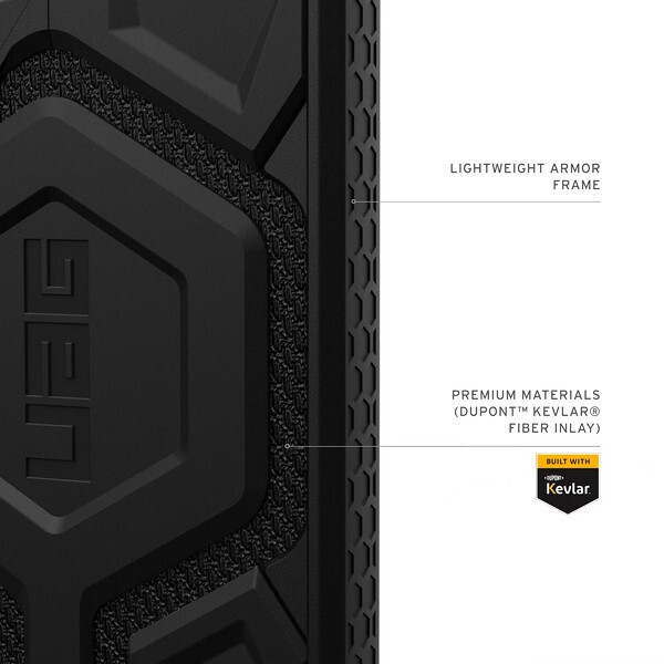 Основу защиты составляет ударопрочный сердечник, который поглощает и равномерно распределяет силу удара. Каркас усилен вставкой из DuPont Kevlar для дополнительной прочности, а поликарбонатная пластина придаёт жёсткость и устойчивость к царапинам. Гибкий резиновый контур смягчает удары, а специальный контурный край с противоскользящим покрытием обеспечивает надёжный захват.