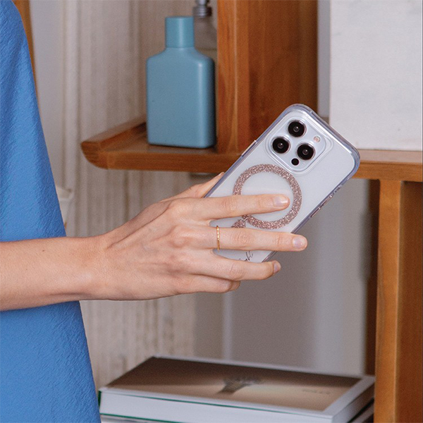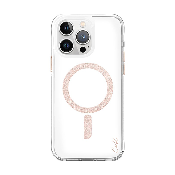 Эффектный чехол COEHL Glace выполнен в удобной форме накладки, надежно крепится, учитывает все конструктивные особенности телефона. Выдерживает удары при падении с высоты до 2.5 метров. Встроенные магниты обеспечивают надежное сцепление с устройствами MagSafe. Защитный ободок вокруг камер предотвращает появление царапин на объективах. Приподнятый бампер не позволит поцарапать дисплей, даже если телефон лежит экраном вниз. Завораживающий дизайн со светоотражающими блестками, обрамляющими магнитное кольцо, дополнен металлическими боковыми кнопками.