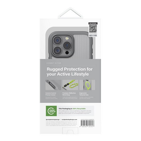 Чехол Uniq Combat Active MagSafe для iPhone 16 Pro Stone Grey (IP6.3P(2024)-COMAMSGRY) с экстремально усиленной защитой углов разработан для людей, ведущих активный образ жизни. Аксессуар устойчив к ударам и способен выдержать падение с высоты до 4 метров, что сравнимо с защитой от падений военного уровня (MIL-STD 810-560.6). Технология ShockSorb защищает телефон от сколов, царапин и прочих повреждений. Бампер усилен специальными рёбрами, которые амортизируют удары, по углам предусмотрены специальные воздушные камеры. На внутренней стороне изделия расположена невидимая перфорированная сетка, которая предотвращает появление конденсата и помогает избежать прилипание задней стенки чехла к смартфону. Клавиши защищены заглушками, интегрированными в чехол - это препятствует попадание частиц мусора, пыли и капель влаги внутрь чехла. Высокие бортики вокруг камеры оберегают объектив от механических дефектов. Благодаря встроенному магниту MagSafe, вы можете использовать другие аксессуары с таким креплением: картхолдеры, зарядки, держатели. Эксклюзивный дизайн со светоотражающими элементами гарантирует, что вы будете видны даже при слабом освещении. Поставляется в фирменной картонной упаковке Uniq.