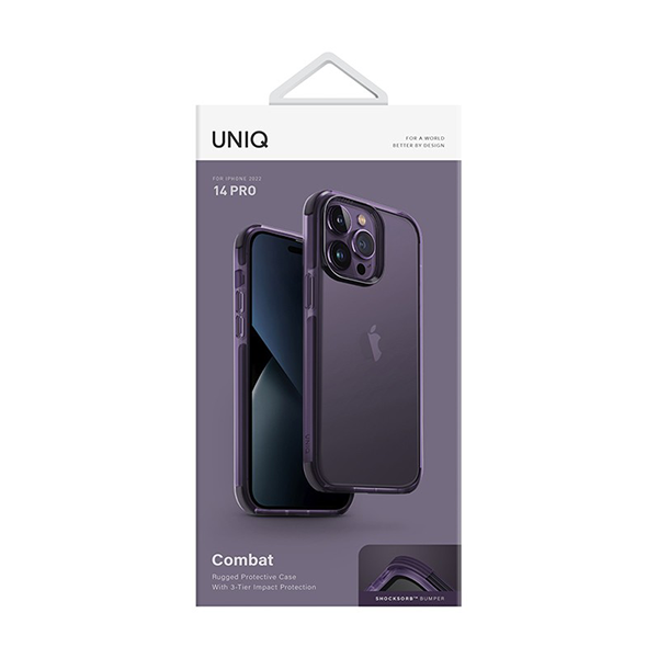 Чехол Uniq Combat для iPhone 14 Pro (IP6.1P(2022)-COMPUR) Purple - ударопрочный чехол из комбинированных синтетических материалов. Прошел жесткие испытания на прочность, невероятно устойчив к различным механическим воздействиям. Приподнятый бампер не позволит поцарапать дисплей, даже если телефон лежит экраном вниз. Защитный ободок вокруг камер предотвращает появление царапин на объективах. Прозрачный чехол Uniq Combat прекрасно сочетается с дизайном айфона, вместе они будут смотреться как единое целое.