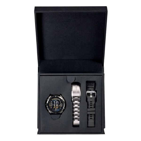 - Сменные ремешки — титановый ремешок для стильного вида и графитовый силиконовый для спортивных занятий.