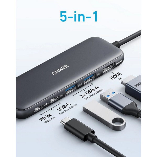 Хаб Anker 332 USB-C Hub 5 в 1 (A8355H11) черный оснащен портом HDMI 4K, портом передачи данных USB-C 5 Гбит/с, двумя портами USB-A 5 Гбит/с и портом PD-IN мощностью 100 Вт.