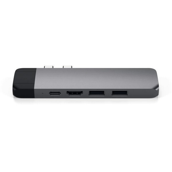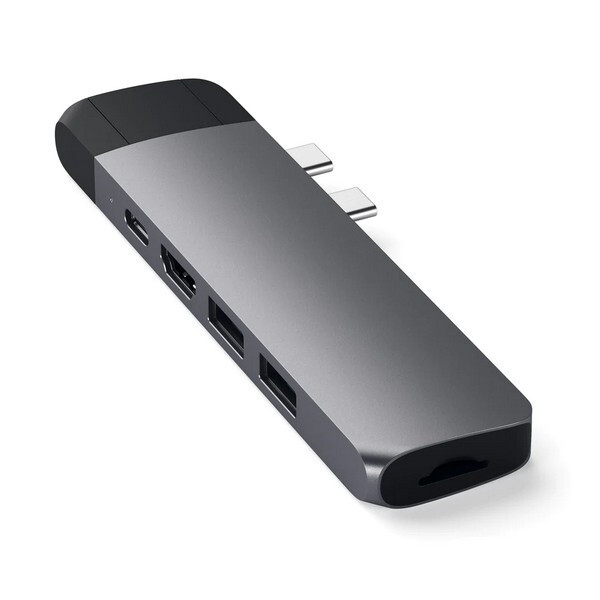 Хаб Satechi Aluminium Type-C Pro Hub Adapter with Ethernet (ST-TCPHEM) - стильный аксессуар для Apple MacBook Pro 13" и 15" 2016-2017. Хаб подсоединяется к ноутбуку с помощью двух USB-C портов одновременно и становился продолжением ноутбука. Устройство оснащено разъемами HDMI, Ethernet, USB C и USB A 3.0, а также есть кардридер, который поддерживает карты памяти формата MicroSD.