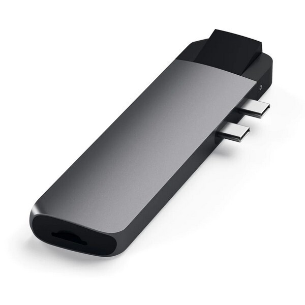 Хаб Satechi Aluminium Type-C Pro Hub Adapter with Ethernet (ST-TCPHEM) - стильный аксессуар для Apple MacBook Pro 13" и 15" 2016-2017. Хаб подсоединяется к ноутбуку с помощью двух USB-C портов одновременно и становился продолжением ноутбука. Устройство оснащено разъемами HDMI, Ethernet, USB C и USB A 3.0, а также есть кардридер, который поддерживает карты памяти формата MicroSD.