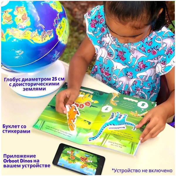 С помощью мобильного игрового приложения с дополненной реальностью глобус увлекательно и подробно расскажет о разных видах динозавров, а комплектный альбом для наклеек и набор ярких стикеров помогут с удовольствием закрепить знания, полученные в виртуальном путешествии.