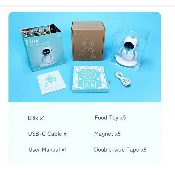 В комплекте: Робот-Eilik 1 шт., Кабель USB-C, Игрушки-еда 5 шт.(случайные), Магнит 5 шт., Двухсторонний скотч 9 шт,Инструкция на русском языке.