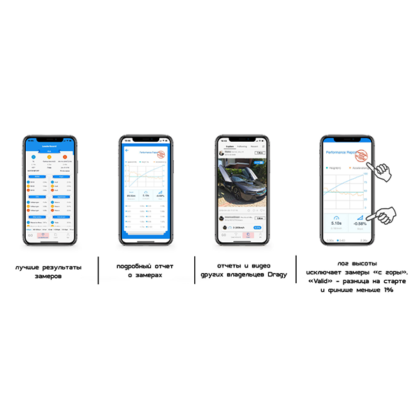 Dragy подключается к смартфону при помощи бесплатного приложения, работает как с iOS, так и с Android. Вы сможете сравнивать свой автомобиль с подобными или просто наблюдать за результатами замеров других пользователей.