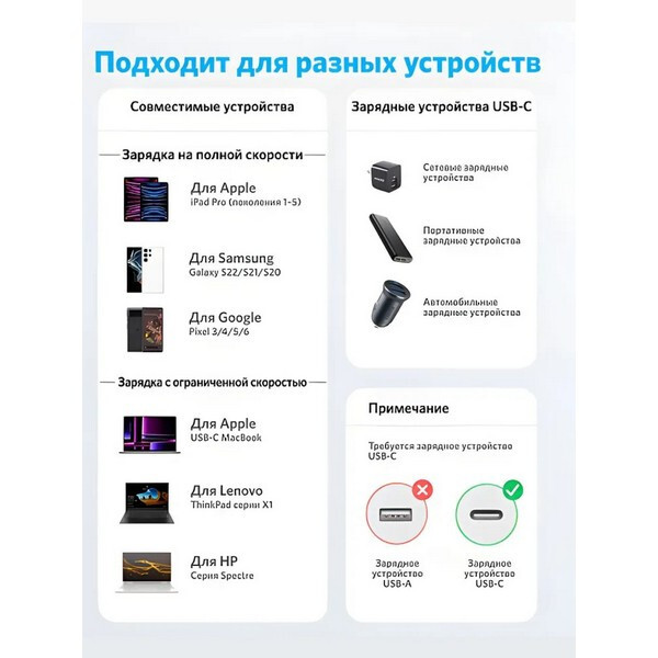 Универсальная совместимость Кабель совместим с широким спектром устройств с разъёмом USB-C, включая смартфоны, планшеты, ноутбуки и другие гаджеты.