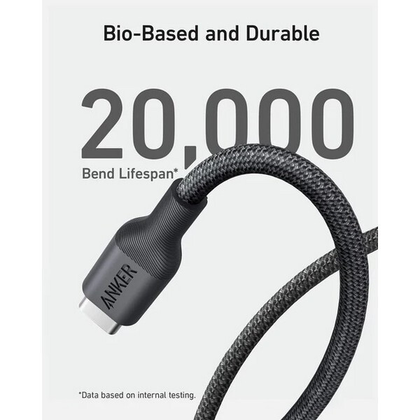 Кабель Anker 544 USB-C TO USB-C 0.9 м (A80F5H11.BK) черный изготовлен из нейлона на биологической основе. Использование нейлона на биологической основе позволяет сократить использование пластика на основе нефти, такого как TPE.
