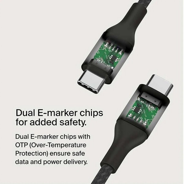Его нейлоновая внешняя оболочка с двойной оплеткой протестирована на устойчивость к 30 000 изгибов, что делает этот кабель USB-C–USB-C надежным и выдерживает ежедневное интенсивное использование. Двойные чипы E-marker с OTP (защитой от перегрева) обеспечивают безопасную передачу данных и питания. Кабель идеально подходит для использования дома, в машине, в офисе или в любом другом месте, где вам нужно быстро передавать данные и быстро заряжать свои устройства. Сертифицирован USB-IF на соответствие стандарту USB 2.0 и соответствует всем электрическим, механическим и экологическим стандартам, гарантируя безопасное и оптимальное взаимодействие с пользователем.