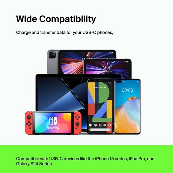 Позволяет подключать и заряжать MacBook, Chromebook, ноутбук Windows, iPad или другое устройство USB-C с помощью прочного кабеля, который протестирован на выдерживание более 25 000 изгибов. Он сертифицирован USB-IF и совместим с USB-C PD для поддержки зарядки мощностью до 60 Вт, обеспечивая безопасную и оптимальную скорость зарядки для различных устройств.