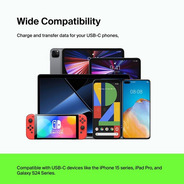 Позволяет подключать и заряжать MacBook, Chromebook, ноутбук Windows, iPad или другое устройство USB-C с помощью прочного кабеля, который протестирован на выдерживание более 25 000 изгибов. Он сертифицирован USB-IF и совместим с USB-C PD для поддержки зарядки мощностью до 60 Вт, обеспечивая безопасную и оптимальную скорость зарядки для различных устройств.