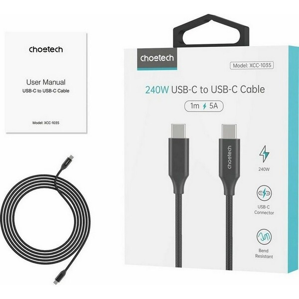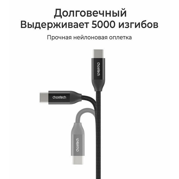 Кабель Choetech USB C to C 240W 5A 1.2 м (XCC-1035) черный оснащен 2 разъемами USB-C и поддерживает протокол быстрой зарядки PD мощностью 240 Вт, что означает, что он подходит как для ноутбуков, так и для смартфонов и планшетов. С его помощью вы сможете очень быстро пополнить заряд ноутбуков, телефонов, наушников и других ваших устройств. Более того, кабель обеспечивает передачу данных со скоростью 480 Мбит /с и отличается своей прочной конструкцией. Он имеет нейлоновую оплетку, которая защищает кабель от повреждений, вызванных вытягиванием и сгибами. Не надо беспокоиться о перегреве вашего оборудования - Choetech XCC-1035 прошел многочисленную сертификацию и испытания, доказывающие, что он соответствует всем стандартам безопасности.