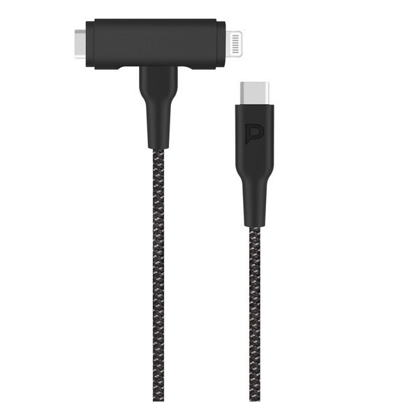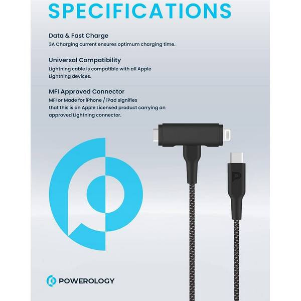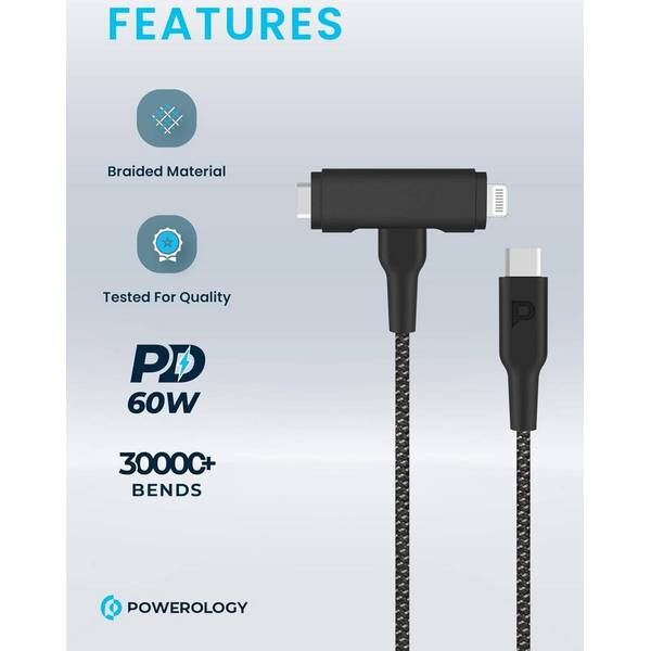 Кабель Powerology USB-C to USB-C + Lightning PD60W (PCAB007BK) Black - улучшите свои ощущения от зарядки с помощью кабеля Powerology MFI Braided Cable, отличного зарядного аксессуара для питания ваших устройств. Оснащенный технологией Power Delivery (PD) и быстрой зарядки, этот кабель обеспечивает впечатляющую мощность зарядки 60 Вт. Его прочная конструкция, защищенная плетеным покрытием, обеспечивает устойчивость к более чем 3000 изгибам. Независимо от того, используете ли вы устройство Type-C или Lightning, вы удовлетворяете все свои потребности в зарядке.