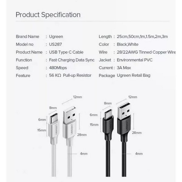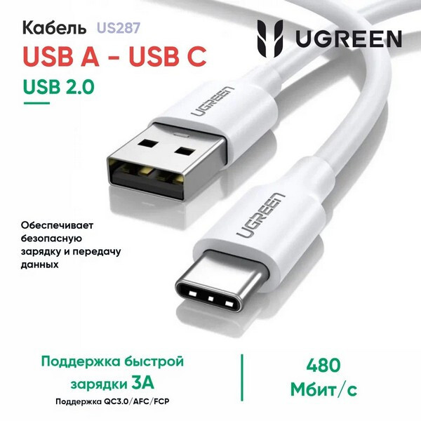 Кабель Ugreen US287 USB-A 2.0 - USB-C Cable Nickel Plating 1м белый (60121) поддерживает быструю зарядку Huawei FCP и быструю зарядку QC 3.0 до 3 А макс., что позволяет заряжать телефоны с поддержкой Qualcomm Quick Charge на полной скорости. Зарядка Samsung S9 занимает менее 2 часов, так же быстро, как и оригинальный кабель. Благодаря этому кабелю USB-A – USB-C, скорость передачи данных между устройствами достигает до 480 Мбит/с, файл размером 1 Гб перенесется всего за 25 секунд. Этот кабель USB-C полностью соответствует протоколу быстрой зарядки QC и имеет встроенный подтягивающий резистор 56 кОм, модернизированный интеллектуальный чип с множественной защитой внутри. Это зарядное устройство Type C обеспечивает надежную проводимость и стабильный зарядный ток, защищая ваши смартфоны от повреждений из-за перегрузки по току или перенапряжения.