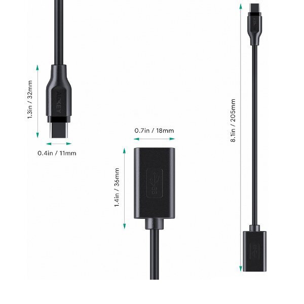 Комплект адаптеров Aukey USB-C to USB 3.0 (2 шт) чёрные (CB-A26) - это компактный переходник длинной в 20 см, благодаря которому вы сможете легко подключать к ноутбуку флешки, внешние накопители, портативные фонарики, вентиляторы и увлажнители воздуха, кабели, и множество других устройств, что значительно расширит возможности вашей техники. Поскольку коннектор Type-C реверсивный, подключить переходник будет легко и просто любой удобной стороной.