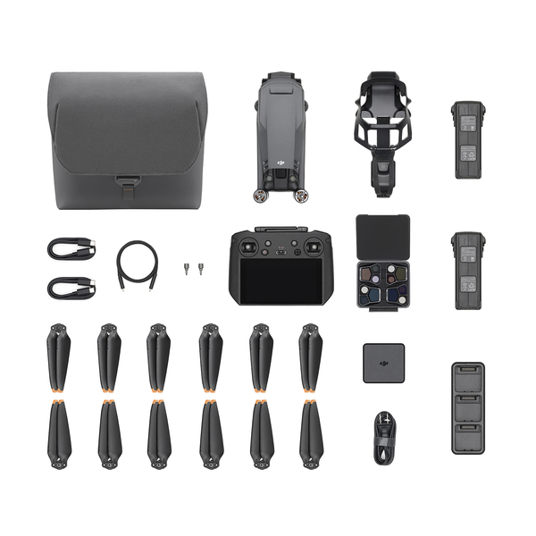 Квадрокоптер Mavic 3 Pro – 1 шт. Пульт дистанционного управления DJI RC Pro – 1 шт. Запасные ручки управления для пульта DJI RC (пара) – 1 шт. Интеллектуальная полетная батарея для DJI Mavic 3 – 3 шт. Малошумные пропеллеры для DJI Mavic 3 (пара) – 6 шт. Защита подвеса для DJI Mavic 3 Pro – 1 шт. Защита носителя данных для DJI Mavic 3 Pro – 1 шт. Кабель для блока питания переменного тока DJI 100W USB-C – 1 шт. Блок питания DJI 100W USB-C – 1 шт. Кабель USB-C к USB-C – 2 шт. Зарядная станция для батарей DJI Mavic 3 (100 Вт) – 1 шт. Комплект нейтральных фильтров для DJI Mavic 3 Pro (ND8/16/32/64) – 1 шт. Наплечная сумка DJI – 1 шт.