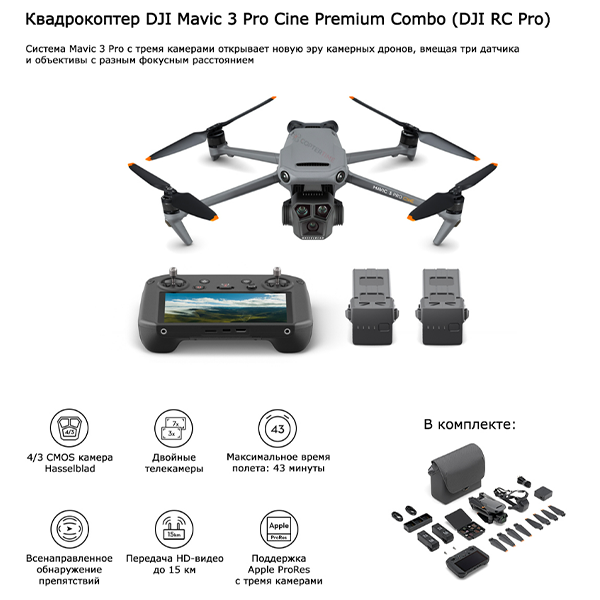DJI Mavic 3 Pro Cine - это беспилотник с расширенными возможностями получения изображений, оснащенный системой с тремя камерами и длительным временем полета. Система камер включает в себя 4/3 CMOS-камеру Hasselblad, среднюю телекамеру 1/1,3 дюйма и телекамеру 1/2 дюйма с 7-кратным оптическим зумом и 28-кратным гибридным зумом. Камера Hasselblad поддерживает 12-битные фотографии RAW с собственным динамическим диапазоном до 12,8 остановок и поставляется с решением Hasselblad Natural Colour Solution, которое точно восстанавливает цвета, воспринимаемые человеческим глазом. Дрон может записывать видео со скоростью 5,1 К / 50 кадров в секунду, DCI 4 К / 120 кадров в секунду и оснащен новым 10-битным цветовым режимом D-Log M, который поддерживает запись до миллиарда цветов. Он обеспечивает время полета до 43 минут и оснащен всенаправленным датчиком препятствий и APAS 5.0 для безопасного полета.
