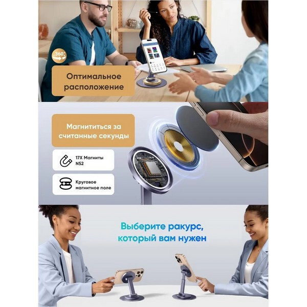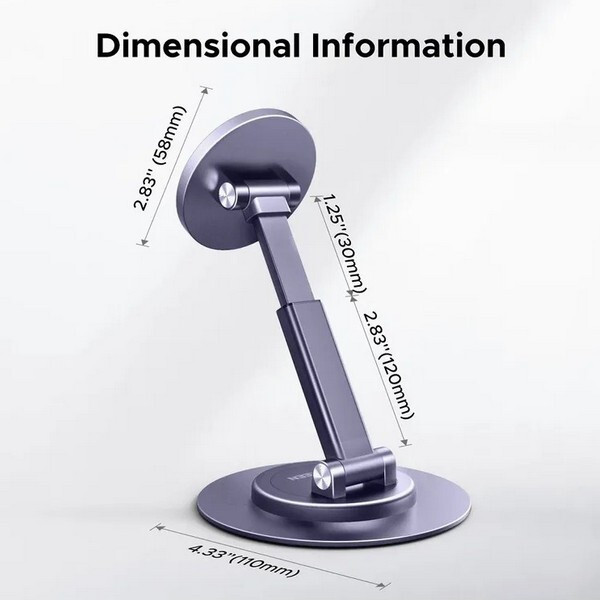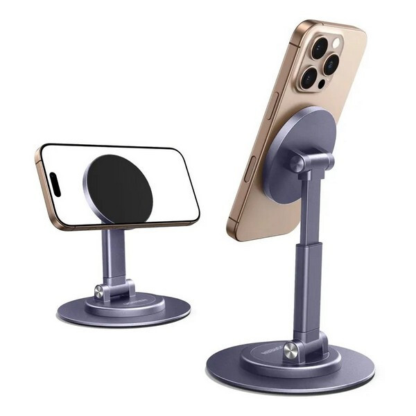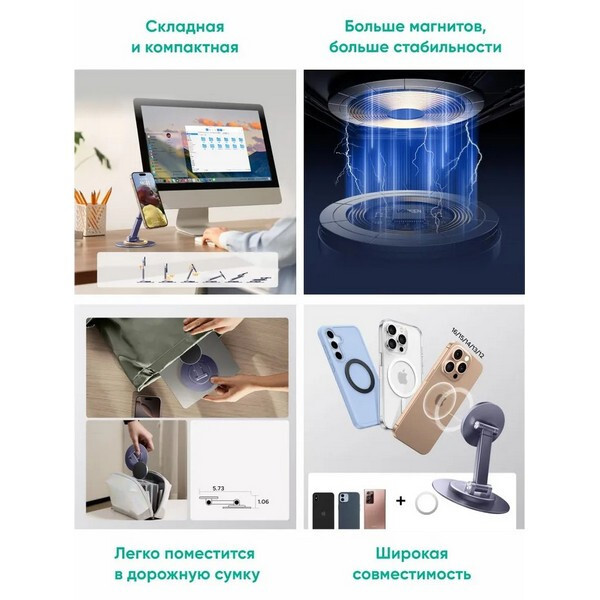 Магнитная подставка для смартфона Ugreen LP862 Magnetic Desktop Phone Stand (65229) Grey выполнена в элегантном туманно-сером цвете и сочетает в себе прочность и стиль благодаря использованию оцинкованного листа, алюминиевого сплава, поликарбоната, магнита и силикона. Она обеспечивает удобную и надежную фиксацию смартфона и позволяет с легкостью регулировать положение устройства: высота изменяется до 15 см, угол наклона достигает 180°, а вращение возможно на 360°, что делает её универсальной для использования в любых условиях — будь то видеозвонки, просмотр видео или работа. В сложенном виде подставка имеет толщину всего 2,7 см, что делает её компактной и удобной для хранения или транспортировки.