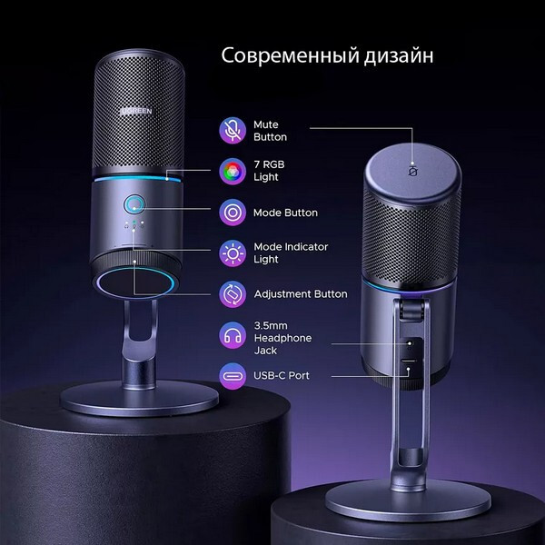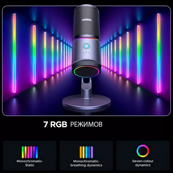 RGB-подсветка с семью режимами, включая динамический эффект, пять однотонных цветов и радужную анимацию, создаёт атмосферу и делает процесс записи более ярким. Для удобства управления микрофон оснащён функциональной кнопкой для переключения режимов работы, регулятором усиления громкости и подсветки, а также сенсорной кнопкой отключения звука. Это позволяет быстро изменять настройки во время использования.
