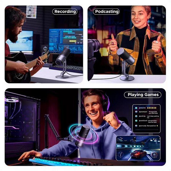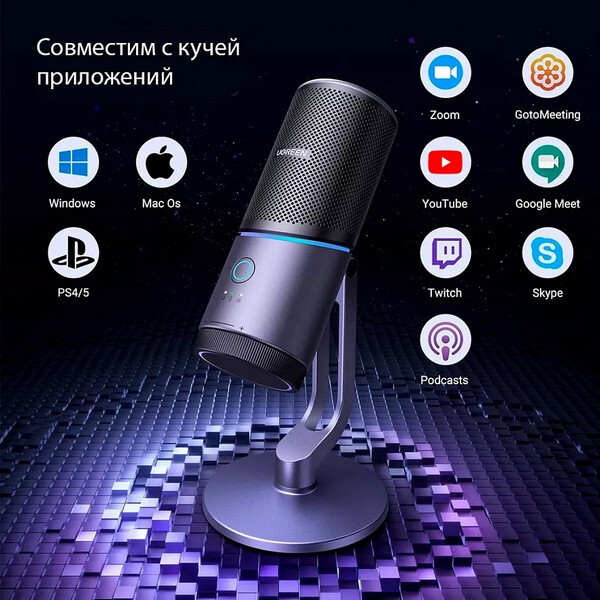 Микрофон подходит для стримеров и геймеров, благодаря выходу для наушников без задержки, что обеспечивает точное отслеживание звука в реальном времени. Он работает по принципу «подключил и используй», не требуя установки драйверов. Совместимость охватывает ПК, ноутбуки, консоли PS4/PS5, смартфоны iPhone 15/16 (с кабелем USB-C на USB-C), Mac, Windows, iOS, а также платформы YouTube и Zoom. Устройство можно установить на стандартный микрофонный держатель с резьбой 3/8" (стойка в комплект не входит), что расширяет возможности его использования.
