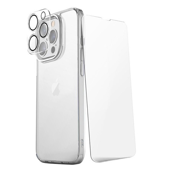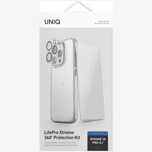 Набор Uniq Bundle 360 (Lifepro Xtreme +Optix glass +Camera lens) для iPhone 15 Pro Max (IP6.7PLPRXCLR(2023)-BUNCLR) прозрачный состоит из ударопрочного чехла Lifepro Xtreme, защитного стекла для дисплея и защитного стекла для камеры.