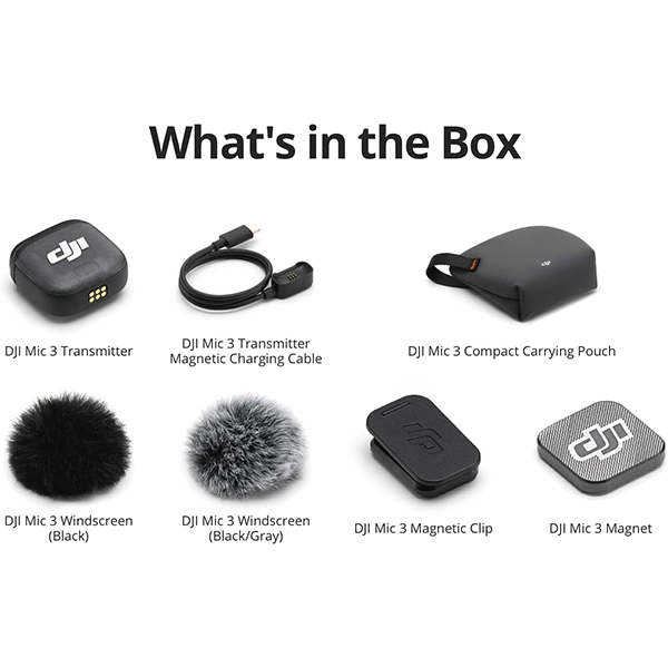 В комплект входит один приёмник DJI Mic 3 RX, зарядный кейс, адаптер для мобильного телефона Mic 3 (USB-C) и многое другое. Подключается к телефонам по Bluetooth, а к Osmo 360, Action 5 Pro, Action 4 и Pocket 3 — через OsmoAudio.
