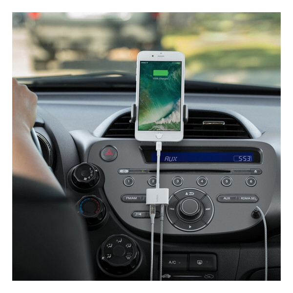 Переходник Belkin Lighting 8-pin папа/мама + Jack3.5 мама (F8J212btWHT) White - это переходник для одновременного прослушивания музыки и подзарядки вашего iPhone. В связи с тем, что новые iPhone не имеют разъема 3.5 мм, а для передачи аудиоконтента используется разъем Lightning, возникает проблема одновременной зарядки устройства и прослушивания любимых композиций. Особенно это проблематично при использовании наушников или АС с коннектором 3.5 мм miniJack. Компания Belkin при плотном сотрудничестве с Apple решила эту проблему, выпустив переходник 3.5 mm Audio + Charge RockStar.